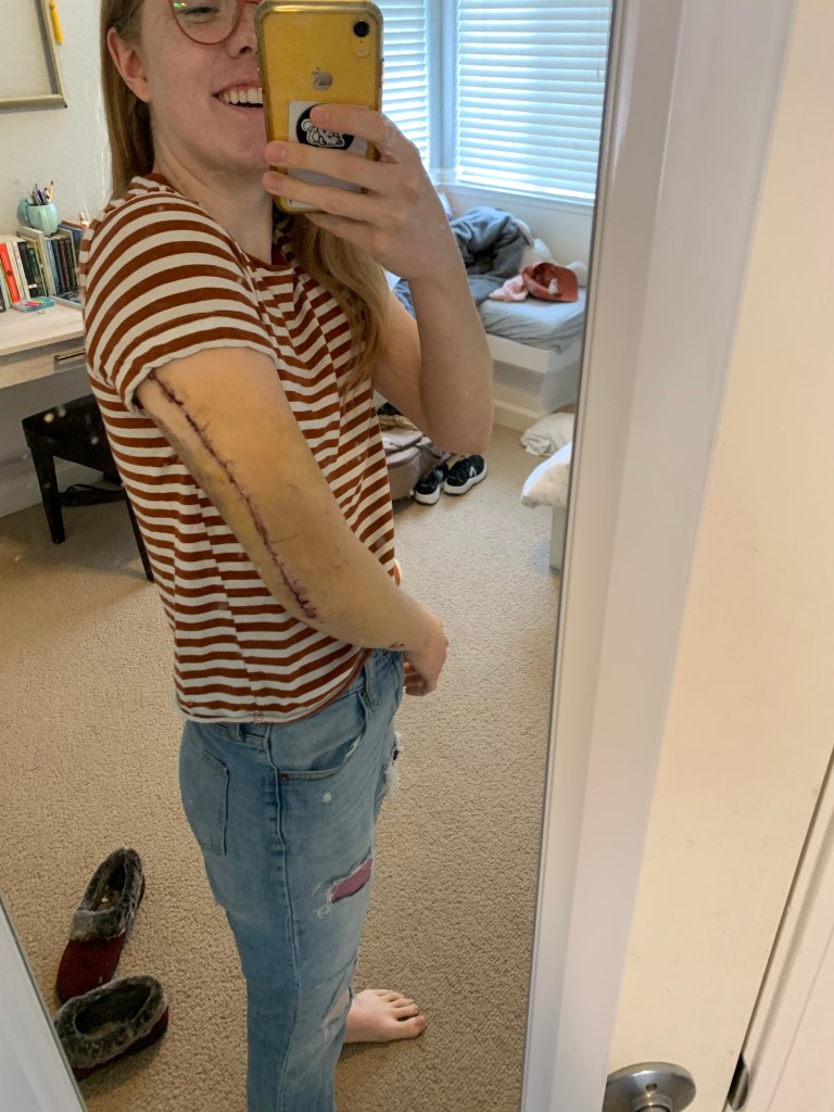 This woman who I had never really met sat with me for five hours in that trauma ward. She sat by my side as I cried, as I threw up (several times), as I could barely breathe from pain, as I tried and failed to put food down, as nurses and doctors asked me a hundred of the same questions and examined my arm again. She crocheted while I let myself rest in fleeting moments. She brushed my hair and helped me wash my face, both of which were still covered in dirt from the crash. She listened to the surgeon and passed along all the information I couldn’t remember (which was most of it) to my dad when he finally arrived late that night. I owe everything to Heather and will be thanking her for the rest of my life.